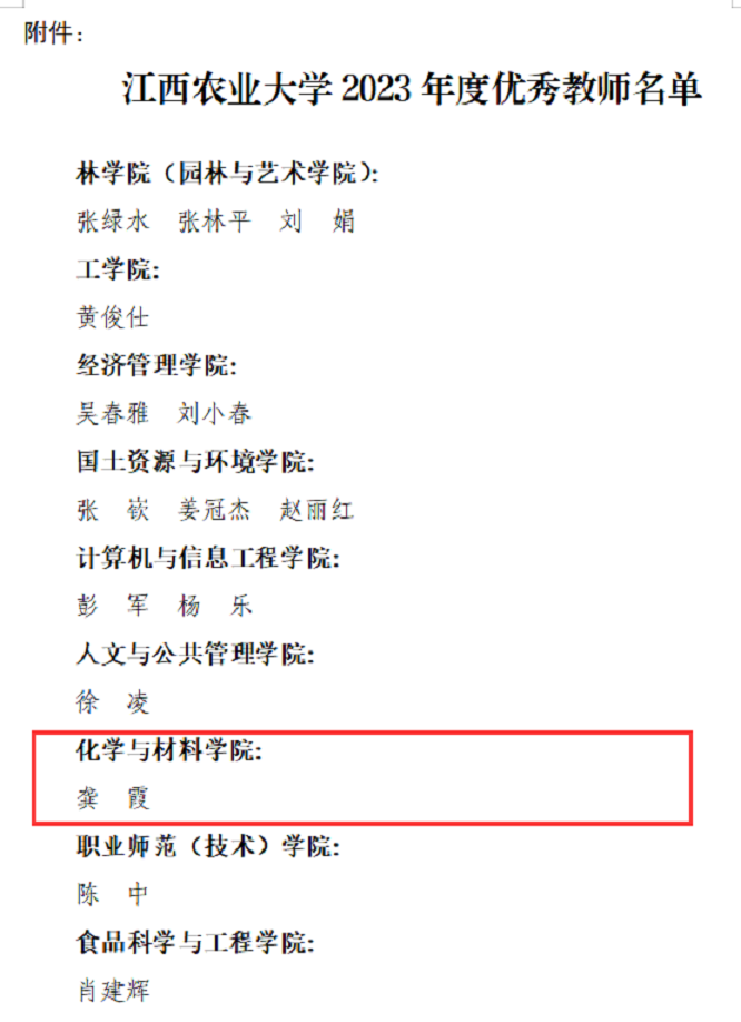 为充分调动广大教师的教学积极性,推进教育教学改革,提高教学质量,学校开展2023年度优秀教师申报与评选工作,按照《江西农业大学优秀教师评选奖励办法(修订)》(赣农大发〔2020〕69号)文件要求,从教学督导听课得分、授课示范教学得分、教师课堂教学满意度得分、教学研究成果得分4方面进行进行评选。2024年1月23日,学校公布了关于表彰2023年度优秀教师的决定,beat365教师龚霞教授以总分排名第一的成绩(95.56分)获得“2023年度优秀教师”荣誉称号。