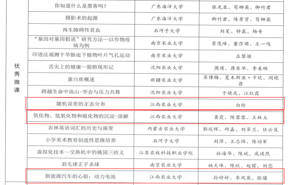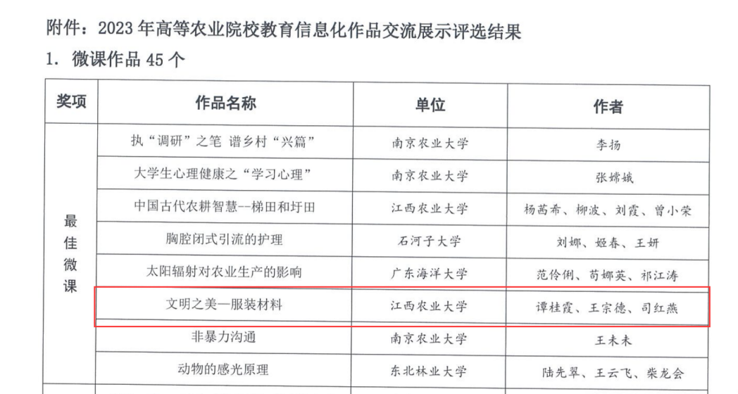 2023年12月6日,中国教育技术协会高等农业院校分会公布了2023年高等农业院校教育信息化作品交流展示评选结果,我校7件作品榜上有名,beat365申报4项作品,4项作品全部获奖,获奖数量居全校第一。谭桂霞、王宗德、司红燕报送的《文明之美——服装材料》被评为“最佳微课”;白玲报送的《随机误差的正态分布》,龚霞、陈蓉蓉、王林玉报送的《氧化物、氢氧化物和硫化物的沉淀—溶解》,孙婷婷、李凤英、张骥报送的《新能源汽车的心脏:动力电池》被评为“优秀微课”。