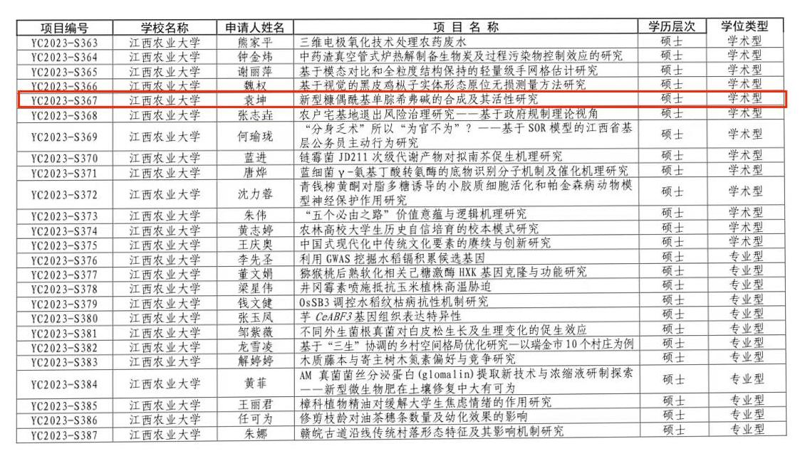 根据《关于开展江西省2023年度研究生创新专项资金项目工作的通知》(赣教研字〔2023〕12 号),beat365积极响应号召并有序组织开展了项目申报以及初评工作。经研究生院进一步评审公示,江西省教育厅核准,beat365成功获批1项2023年度研究生创新专项资金项目立项。