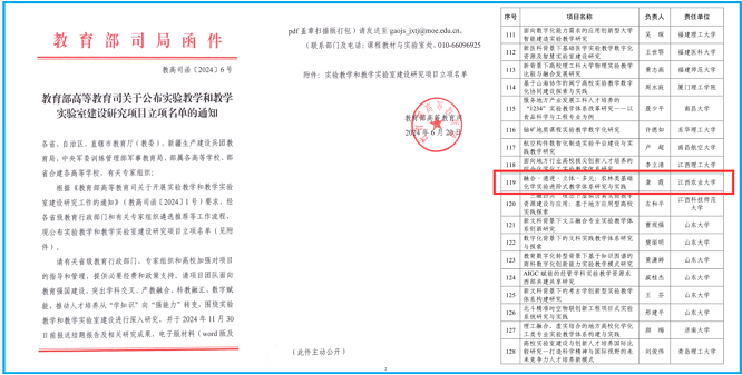 2024年6月20日,教育部教高司函【2023】6号文件公布了“实验教学和教学实验室建设研究项目”立项名单,beat365副院长龚霞教授团队的“融合·递进·立体·多元:农林类基础化学实验进阶式教学体系研究与实践”项目获得立项。