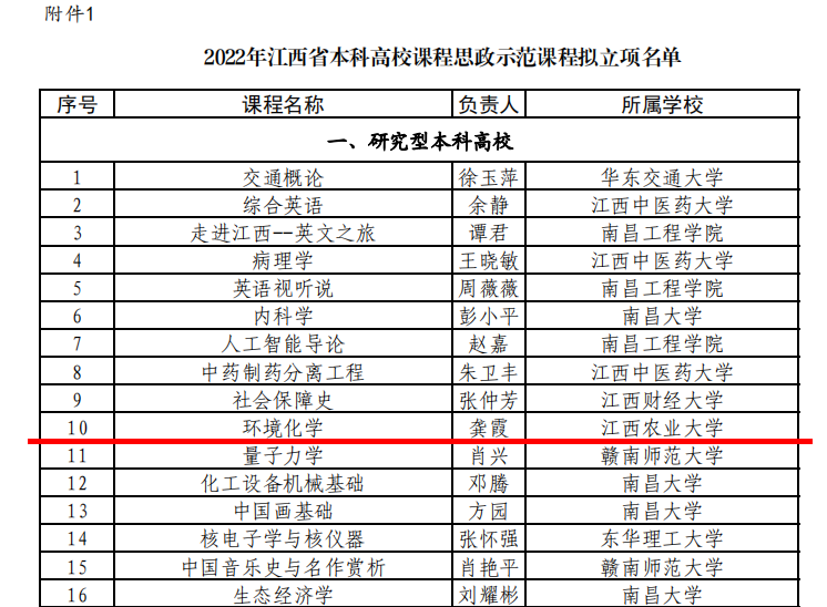 2022年12月,根据省教育厅《关于开展课程思政示范项目建设工作的通知》,经学校审核推荐,省教育厅组织专家网络评审,我校获批2项2022年本科高校课程思政示范课程(教学名师、教学团队),beat365龚霞教授的“环境化学”课程和教学团队被立项为江西省课程思政示范课程、教学名师和教学团队。