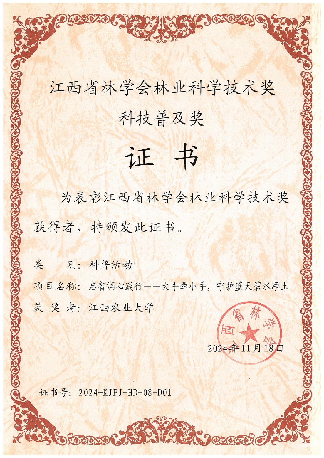 据悉,江西省林学会林业科技普及奖主要奖励在江西省林业科普创作、科普传播、科普促进等方面作出突出贡献的集体和个人。科技普及奖分科普作品、科普活动、科普人物三类,每两年评审一次。