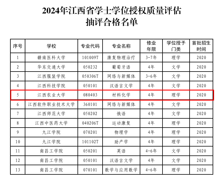 2025年12月16日,江西省人民政府学位委员会办公室公布了全省高校学士学位授权质量合格评估抽评结果。beat365材料化学专业在此次评估中表现优异,顺利通过评审。