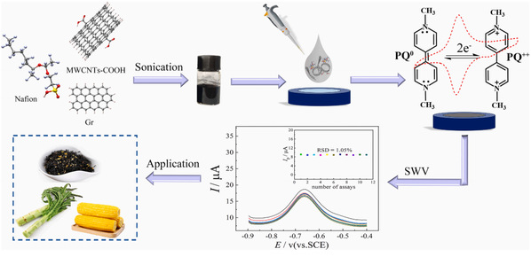 百草枯(Paraquat, PQ)是一种联吡啶类除草剂,在农业中广泛使用会导致食品污染和环境污染,通过食物链对人们食品安全也会产生严重威胁,本文开发了一种新型聚合物纳米复合材料,即高导电石墨烯和多壁碳纳米管共同改性的Nafion (Nf-Gr-MWCNTs-COOH),通过电化学传感的方法用于食品中PQ的检测。Nafion是一种超强酸催化剂,尽管它对PQ有电化学氧化还原响应,但由于其固有的电子导电性差,导致灵敏度低,很少用作电催化剂来放大检测信号,因此可以通过改性的方法来提高对检测物的灵敏度。在各种改性剂中,还原氧化石墨烯(Gr)可以有效地改善MWCNTs的分散性,同时MWCNTs可以通过π-π相互作用增强Gr的电导率和比表面积,从而形成在水中高度分散的三维结构纳米杂化物,与Nafion结合可以增加Gr-MWCNTs-COOH的分散性和稳定性,对PQ的检测具有优异的灵敏度和稳定的输出信号。