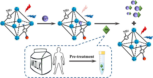 本文构建了基于双发射铕掺杂的UiO-66 (Eu@UiO-66-NH2-PMA)的比率荧光生物传感平台,用于组氨酸血症生物标志物组氨酸(His)的高灵敏度和选择性检测。通过UiO-66-NH2-PMA的游离-COOH与Eu3+之间的配位作用,采用合成后修饰的方法合成了Eu@UiO-66-NH2-PMA(PMA:均苯四酸),其表现出同时获得宽配体发射和尖锐Eu3+发射的特征峰。考虑到Cu2+对Eu3+具有优异的荧光猝灭能力以及与His的优异亲和力,因此特意将其引入到Eu@UiO-66-NH2-PMA中,作为目标His响应的活性位点。Eu@UiO-66-NH2-PMA/Cu2+/His三元竞争体系检测限低至74 nM,具有优异的选择性和良好的抗干扰能力,可灵敏分析牛奶和人血清中的His水平样品。