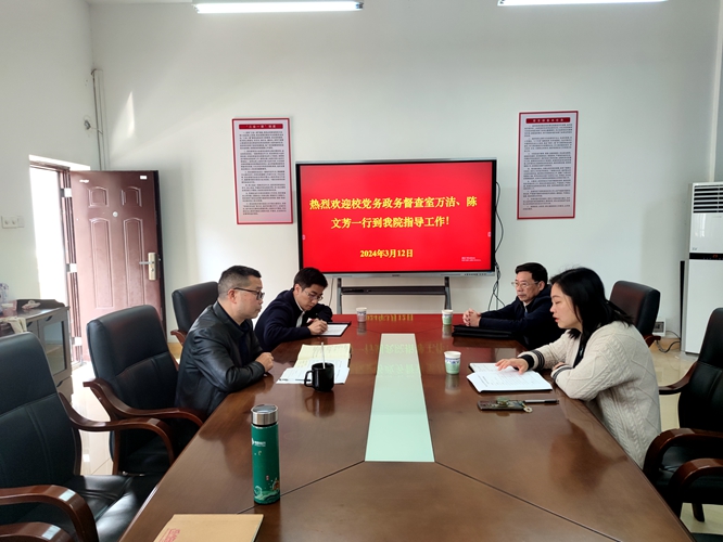 2024年3月12日10:00,学校党务政务督导组副主任万洁、正处级督导员陈文芳到beat365开展学校第四次党代会氛围营造和中共中央颁布“三个条例”学习宣传情况专项督查,院党委书记刘庆言、学生党总支书记彭玉萌及党委组织员廖超参与本次督查座谈会,会议由刘庆言主持。