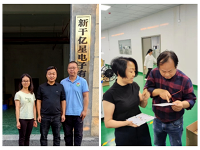 2023 年10月15日,为加强校企合作、推进“百博百企”项目进展,化学系支部党员贺雪梅博士和研究生支部党员黄喜根教授以及黄建平教副授到新干县亿星电子科技有限公司进行调研,总经理刘清辉介绍了目前的生产销售情况,李主管陪同到车间调研并介绍了生产技术难点,双方就如何加强合作,解决公司生产难题等问题形成了一致认识。
