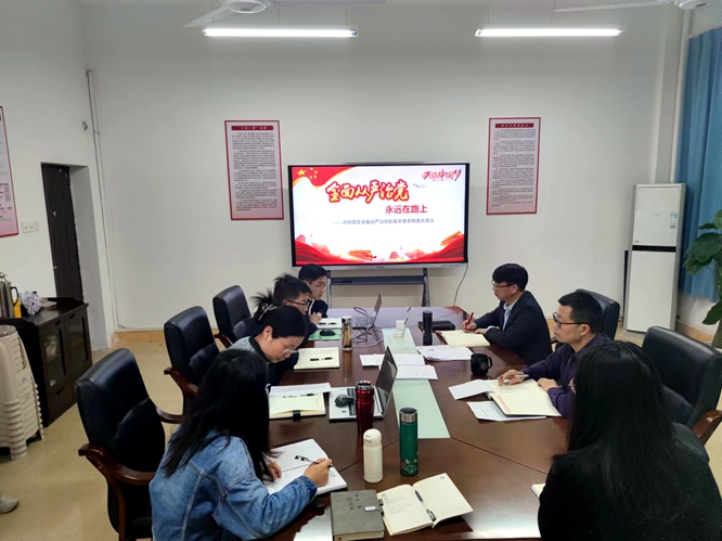 会上,学院学生党总支书记彭玉萌组织大家一起学习了《全面从严治党永远在路上》专题学习材料,系统深入阐述了为什么要“全面从严治党”、“全面从严治党”的历史沿革、“全面从严治党”治什么及“全面从严治党”如何做四个方面的内容。班子成员分别结合个人工作实际分享了学习心得体会。