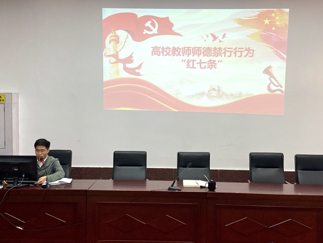 会上,学生党总支书记彭玉萌组织大家学习了《高校教师师德禁行行为红七条》,集中观看了师德师风警示教育典型案例。