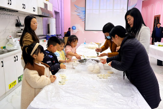 经过几个小时的休闲娱乐后,大家围着餐桌一起包饺子,和面、揉面、切段、擀皮、调馅,包馅,每一道工序上都无不欢声笑语。大家齐心协力,精诚团结。一个个神采各异的饺子都摆在了盘子当中,当一盘盘美味可口的饺子端上餐桌,大家的心在欢声笑语中贴得更近了,温馨的气氛充满整个场馆。
