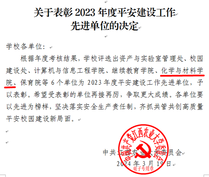 日前,学校发布《关于表彰2023年度平安建设工作先进单位的决定》,beat365获评江西农业大学2023年度平安建设工作先进单位。