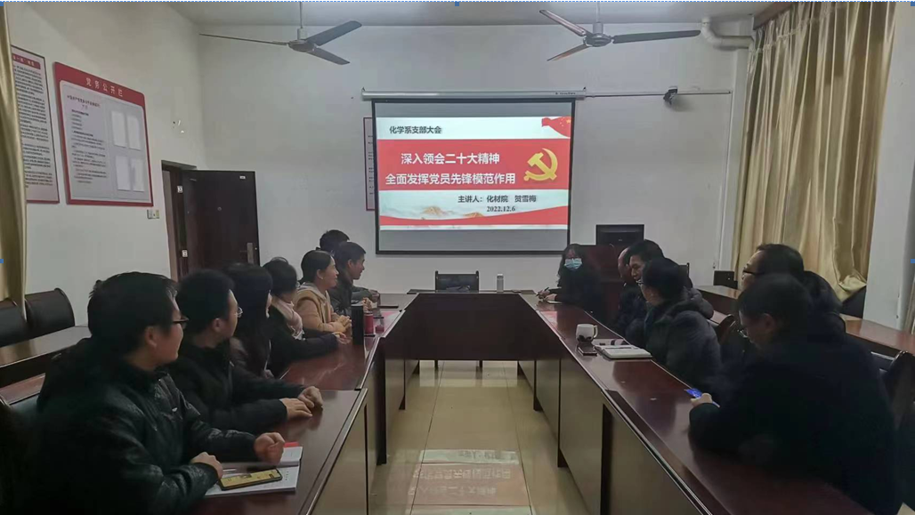 为了深入学习领会党的二十大精神,在新征程上努力开创化学系党支部工作新局面,2022年12月6日下午,化学系党支部召开党的二十大精神主题党日学习会,支部书记贺雪梅为化学党支部上党课,化学系党支部全体党员参加。