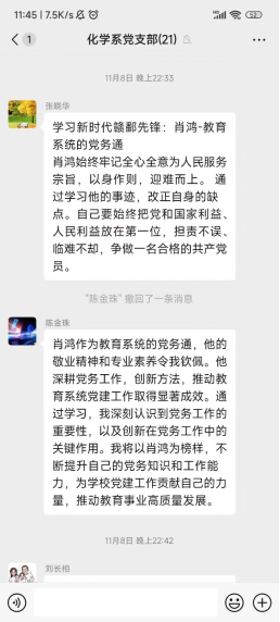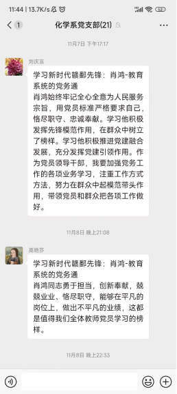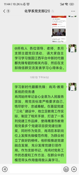 2024年11月7日,为深入学习榜样精神,提升党员思想政治觉悟,化学系教工党支部组织开展线上党日活动——学习“新时代赣鄱先锋”。