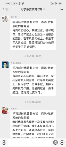 学习活动中,支部党员通过自主观看专题纪录片、研读先进事迹材料等形式,深入了解学习了新时代赣鄱先锋模范的突出贡献与感人事迹。之后,支部党员在支部群交流了心得体会,大家纷纷表示,要以赣鄱先锋为榜样,不断学习,提升自我,为教育事业添砖加瓦。