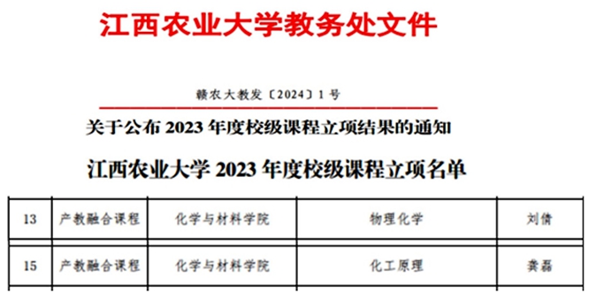 江西农大教务处文件(赣农大教发〔2024〕1 号)公布了“关于公布 2023 年度校级课程立项结果的通知”,对33 门课程建设予以立项。其中,材料与化工支部党员刘倩、龚磊申报的《物理化学》和《化工原理》产教融合课程建设获批。两位老师表示将努力构建和优化课程体系,为提高我校本科人才培养质量做出贡献。