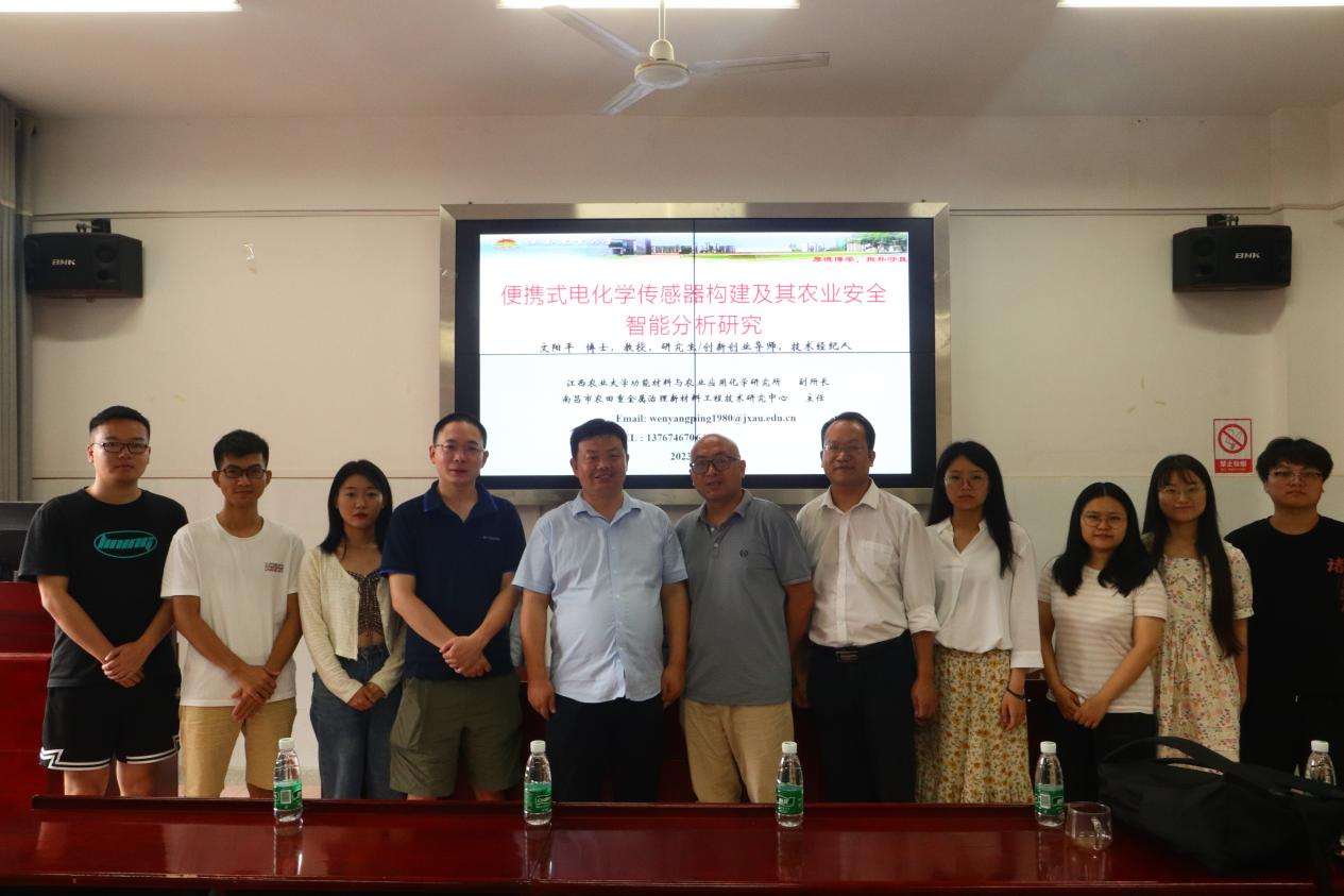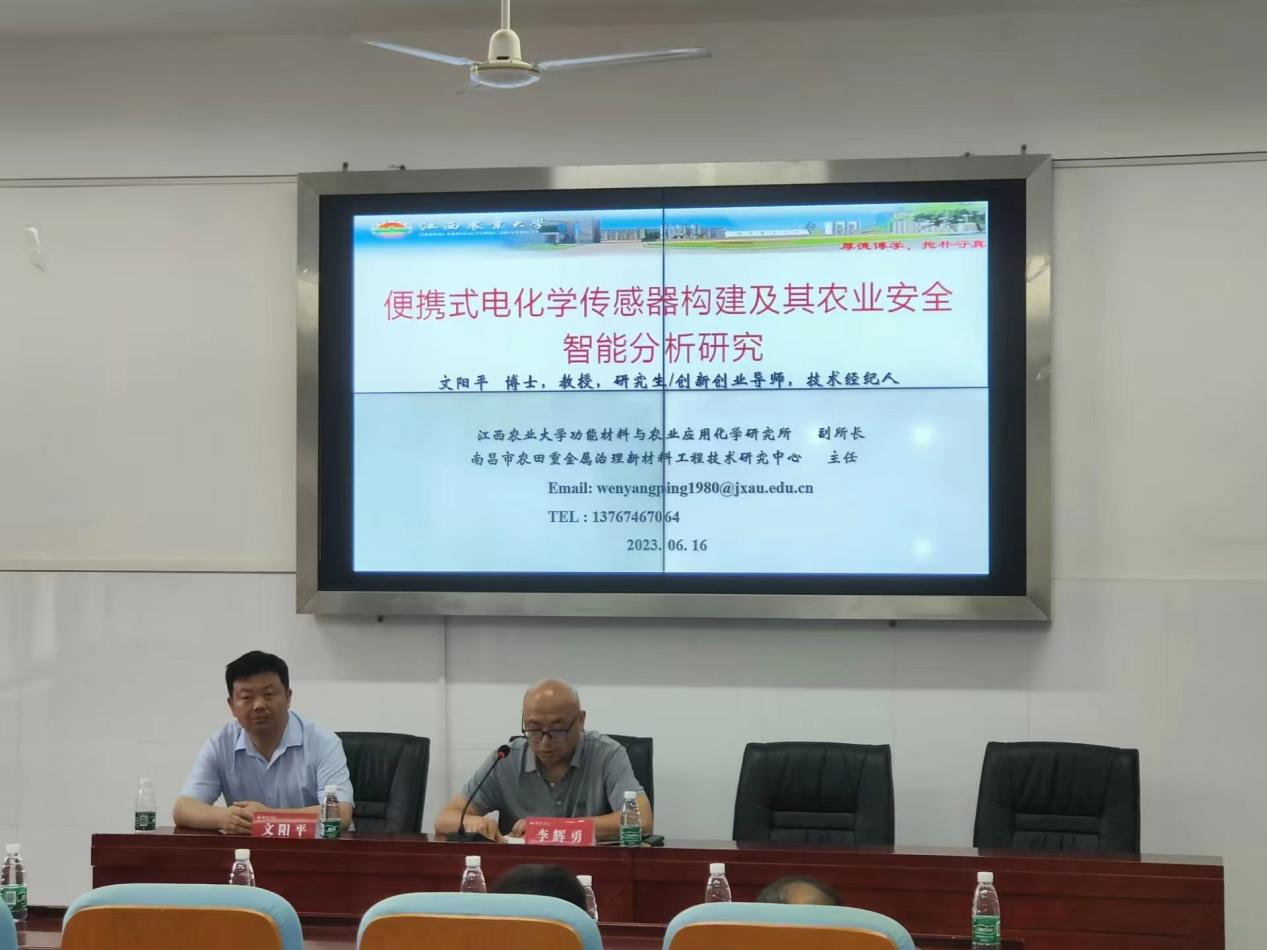 在本次报告中,文阳平教授以“便携式电化学传感器构建及其农业安全智能分析研究”为汇报主题,在以“柔性集成电极”等四大基础背景技术下,重点介绍了高灵敏、快速、简便、廉价、便携式、无线智能检测新方法,实现了对农田环境和农产品中各成分的快速检测,这对保障农产品和食品安全及环境安全至关重要。在众多传统分析方法中,传感器因其操作简单、成本划算、检测快速、灵敏度高和户外使用等优点而备受青睐。更重要的是,电化学传感器微型化、智能化、无线传输,电极可通过材料表面图案化制备技术轻松获取,无需复杂、繁琐、费时的传统制备工艺。最后,文阳平教授对化材学院师生所关心的问题进行了详细的解答,李辉勇副院长结合会议交流情况进行总结,会后对农林高校化材学院教师科学研究进行交流,奠定了两校化材学院交流与合作的前期基础。