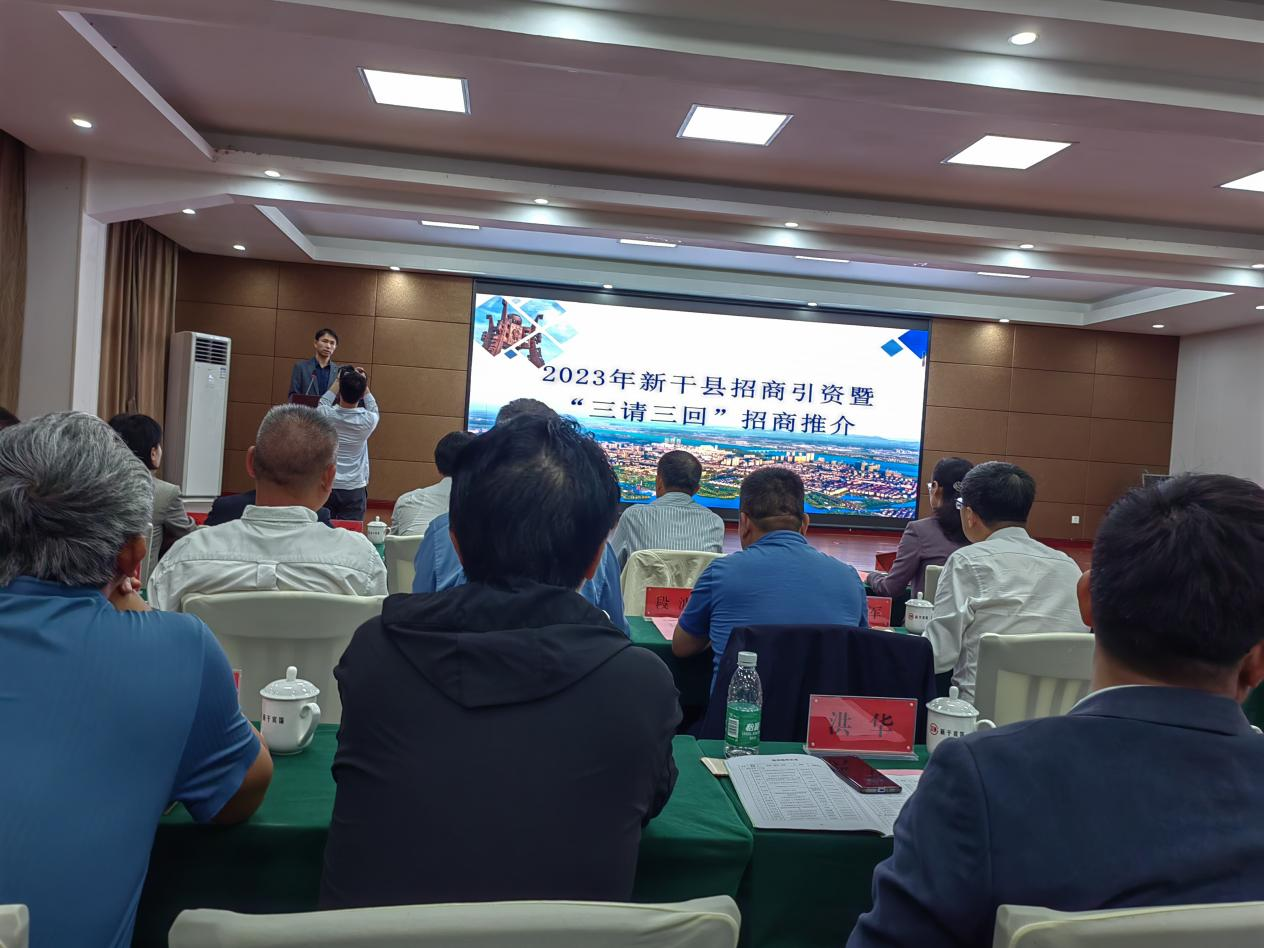 2023 年5月1日 ,新干县委、县政府抓住“五一”节假日,在外乡贤回乡探亲的时机,邀请了50余名乡友、校友、战友以及企业家朋友共同举行“三请三回”恳谈会。县委常委、统战部唐部长主持,县政府副县长杨成奎作招商推介。江西天宇化工有限公司总经理作为外地投资的化工企业代表发言,化材院研究生支部黄喜根教授作为科技代表,受邀参加了会议。