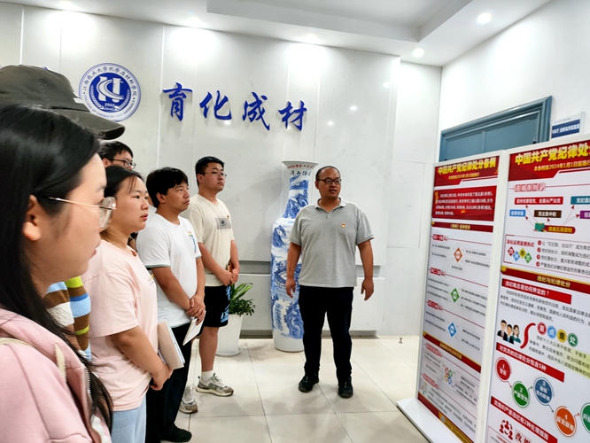 2024年5月21日下午,本科生第二党支部全体党员集体参观学习了学院设立的党纪学习教育宣传栏,支部书记廖超就宣传栏上的一些重点内容向党员进行了强调。