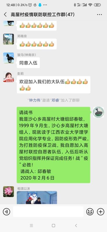 “我是沙心乡高屋村大塘组邱春敏,19999月生,沙心乡高屋村大塘组人,现就读于江西农业大学理学院应用化学专业,因防疫形势严峻,为打胜防疫保卫战,我志愿加入高屋村联控志愿者队伍,听从党组织指挥并保证完成任务。”这是我校应化1702班的邱春敏同学用微信赣州市于都县沙心乡高屋村村干部发出的请战申请书。疫情来袭,村里建立联防联控工作组急需青年志愿者,邱春敏第一时间请战,在村干部的带领下工作在联防联控一线,主要负责疫情排查、防控宣传及守卡工作。