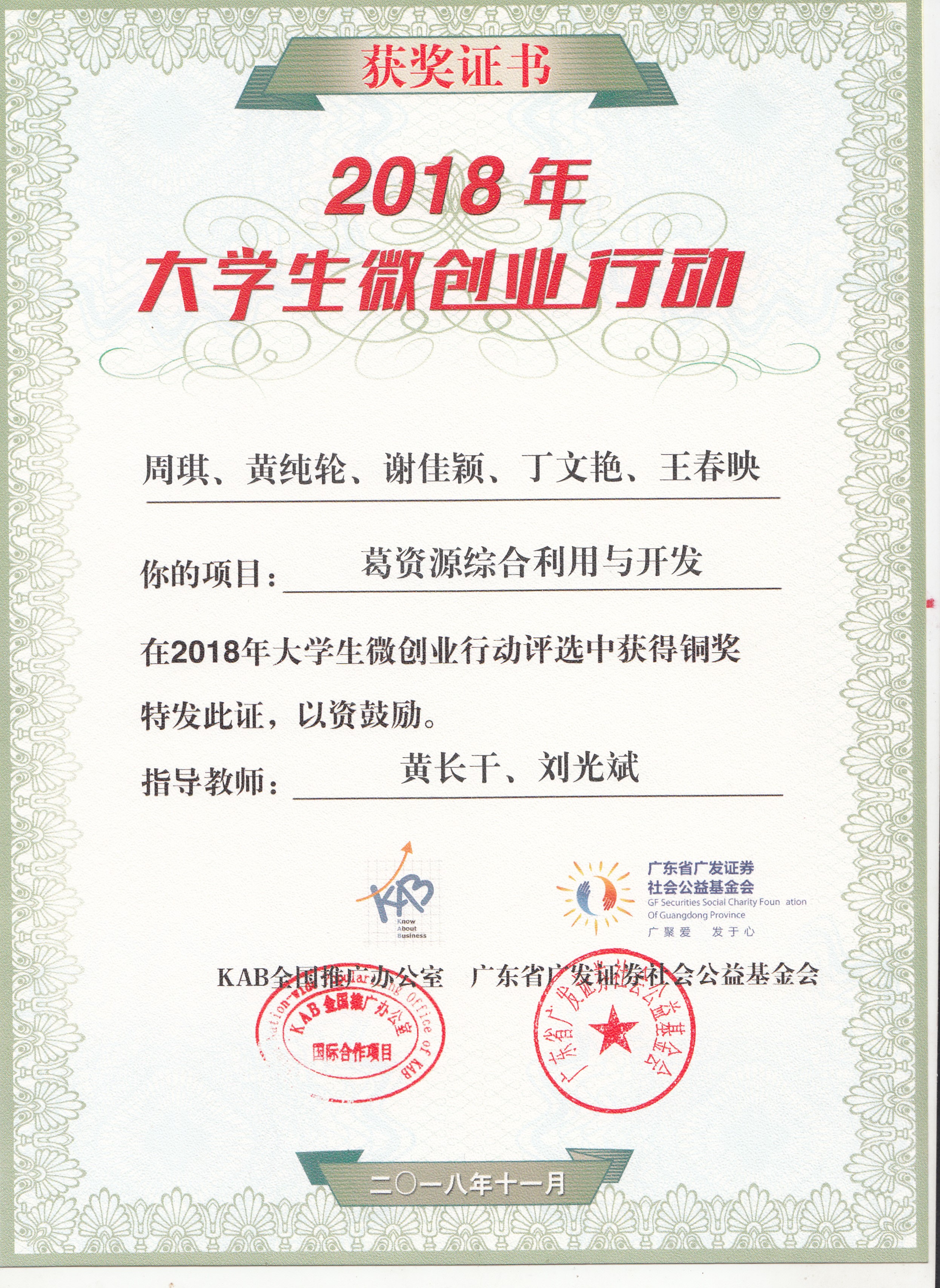 11月21日,由中国青年报社、KAB全国推广办公室及广发证券社会公益基金会等联合举办的“全国大学生微创业行动”成果发布会在中国人民大学落下帷幕。由beat365副院长黄长干教授指导,beat365学生周琪、黄纯轮、丁文艳、王春映参与申报的项目《葛资源综合利用与开发》获微创业项目铜奖,该项目也是江西省高校在此次大赛中的唯一获奖项目。