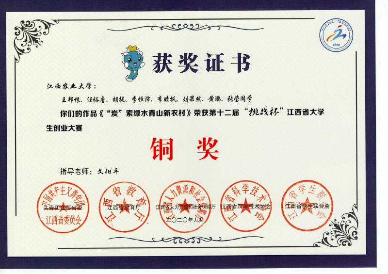 beat365应化1701班王上源同学设计的项目《生存有道——基于小学生综合实践课的教育培训服务》和应化1703班王邦根同学设计的项目《“炭”索绿水青山新农村》双双荣获省级铜奖。此外,beat365学生在江西农业大学第十届大学生创业计划竞赛暨2020年“挑战杯”大学生创业大赛校内选拔赛中表现优异,荣获校级一等奖、二等奖、三等奖、优胜奖各一项,学院获评校优秀组织奖。