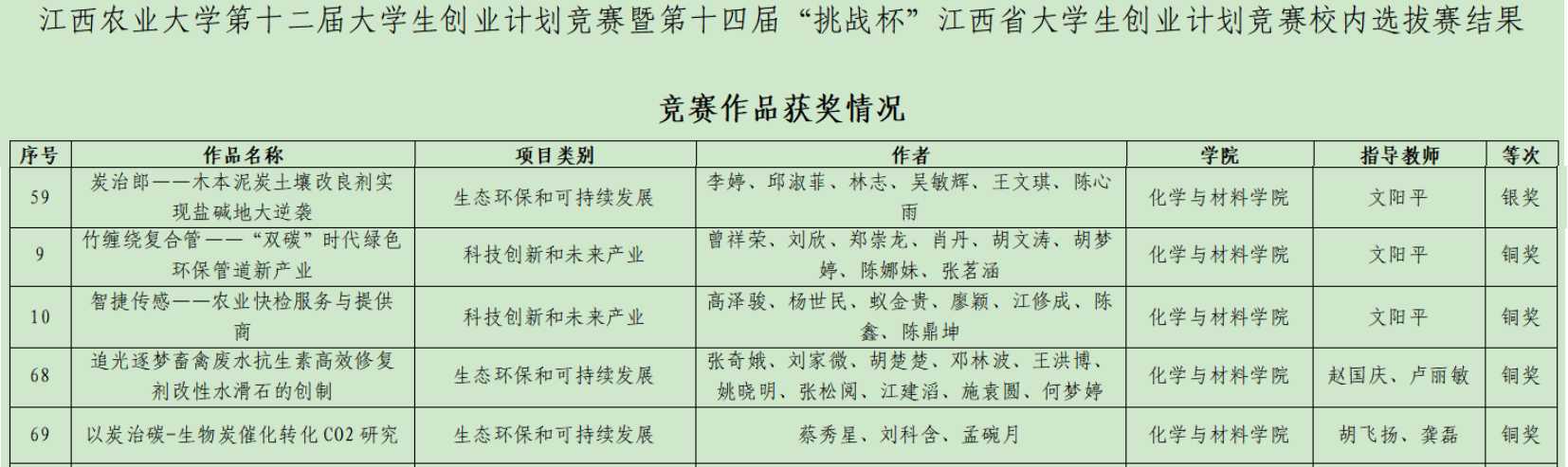 9月3日,第十二届大学生创业计划竞赛暨第十四届“挑战杯”江西省大学生创业计划竞赛校内选拔赛圆满落幕。beat365《炭治郎——木本泥炭土壤改良剂实现盐碱地大逆袭》(指导老师:文阳平,团队成员:李婷、邱淑菲、林志、吴敏辉、王文琪、陈心雨)获银奖;《竹缠绕复合管——“双碳”时代绿色环保管道新产业》(指导老师:文阳平,团队成员:曾祥荣、刘欣、郑崇龙、肖丹、胡文涛、胡梦婷、陈娜妹、张茗涵)和《智捷传感——农业快检服务与提供商》(指导老师:文阳平,团队成员:高泽骏、杨世民、蚁金贵、廖颖、江修成、陈鑫、陈鼎坤)获铜奖;《追光逐梦畜禽废水抗生素高效修复剂改性水滑石的创制》(指导老师:赵国庆、卢丽敏,团队成员:张奇娥、刘家微、胡楚楚、邓林波、王洪博、姚晓明、张松阅、江建滔、施袁圆、何梦婷)和《以炭治碳-生物炭催化转化CO2研究》(指导老师:胡飞扬、龚磊,团队成员:蔡秀星、刘科含、孟碗月)获铜奖。此外,beat365获优秀组织奖,学工办邓雪云老师获大赛组织先进个人奖。