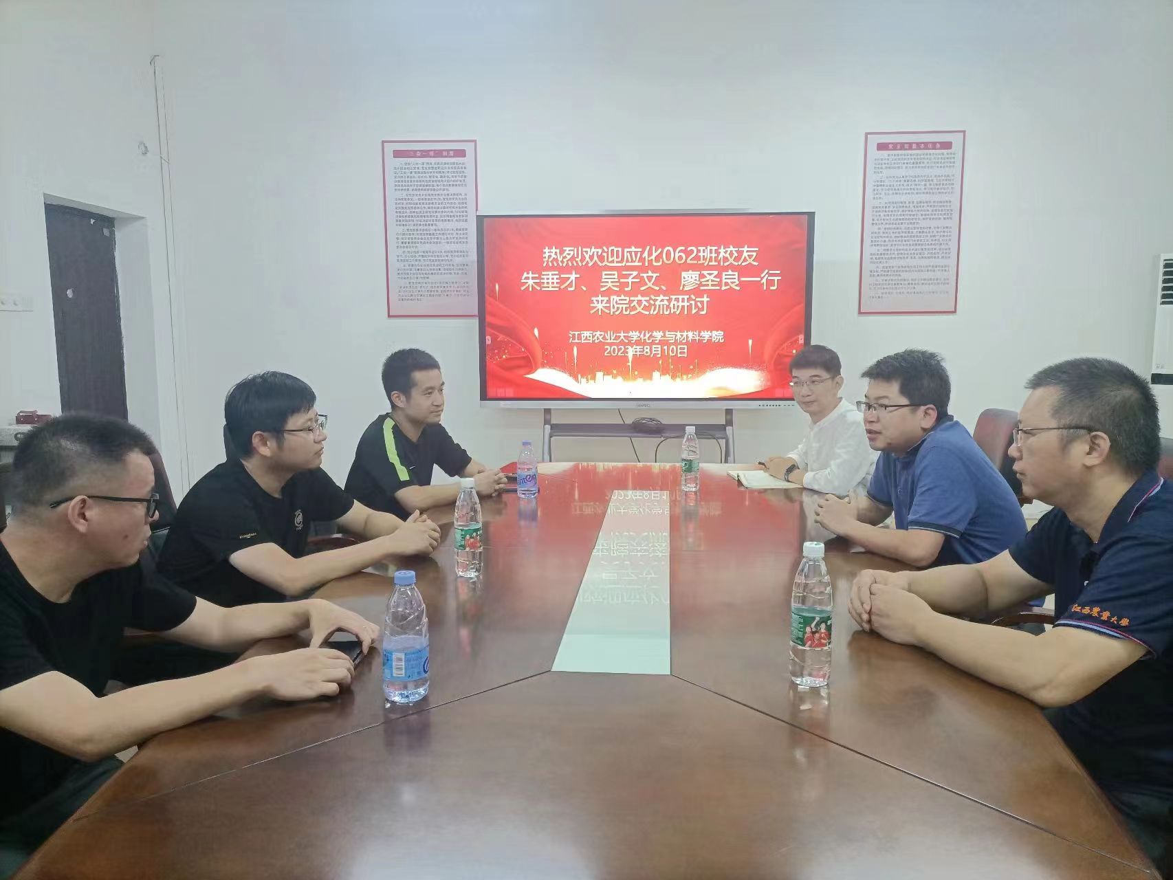 8月10日,应化062班校友美的集团总部区域经理朱垂才、青岛贞开生物医药技术有限公司经理吴子文、江西省农科院助理研究员袁丽娟、江西农业大学林学院副研究员廖圣良等5位校友回学院开展交流。学院副院长卢丽敏、团委书记冷飞翔和办公室吴奎主任热情接见了5位校友。任课教师代表黄喜根、彭大勇等出席了交流会。交流会上,5位校友畅所欲言,感慨母校变迁,回忆校园时代往事,分享了毕业至今个人生活和工作的情况,同时就校友事务、双方交流合作进行了深入交流。学院领导及教师代表对校友们毕业之后所取得的成绩表示祝贺,祝愿校友们未来更美好,欢迎校友们有时间常回母校母院交流。