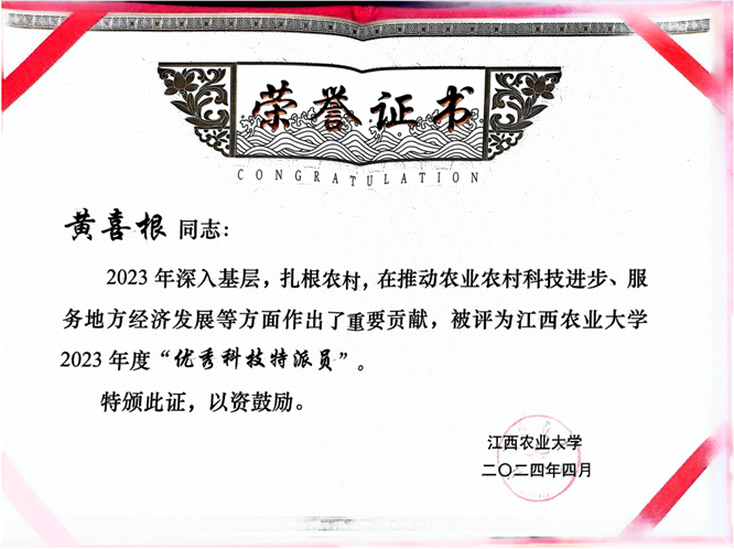 据了解,本次共有20名同志荣获学校2023年度“优秀科技特派员”称号,beat365黄喜根教授名列其中,这也是黄喜根教授连续第七年荣获此殊荣。