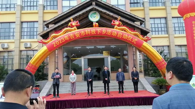 2023 年3月30日,吉安市科技局在新干召开2023 年度吉安市科技下乡活动启动会,新干县人民政府副县长杨成奎同志致辞,省农业科学院蔬菜花卉研究所周劲松、江西腊月红生态果业有限公司负责人聂雄辉分别做了典型发言,市科技局副局长周俊才同志宣布活动启动,参加此次活动的科技人员和农户有200余人,启动会后beat365黄喜根教授、彭大勇和黄建平博士分别到基地调研和指导。