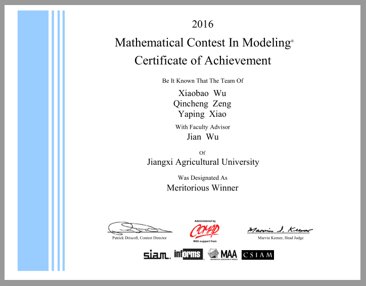 今年2月份,beat365组织大学生参加了由COMAP(the Consortium for Mathematics and Its Application,美国数学及其应用联合会)主办的国际性数学建模竞赛。据美国大学生数学建模竞赛官网公布消息,理学院数学系伍健老师指导的队伍获得Meritorius(一等奖),参赛队员来自理学院的吴晓宝、肖娅萍和工学院的曾钦城;刘章老师指导的队伍获得Successful Participant(三等奖),参赛队员来自理学院的刘禾铭和经管学院的詹婷、刘夏。