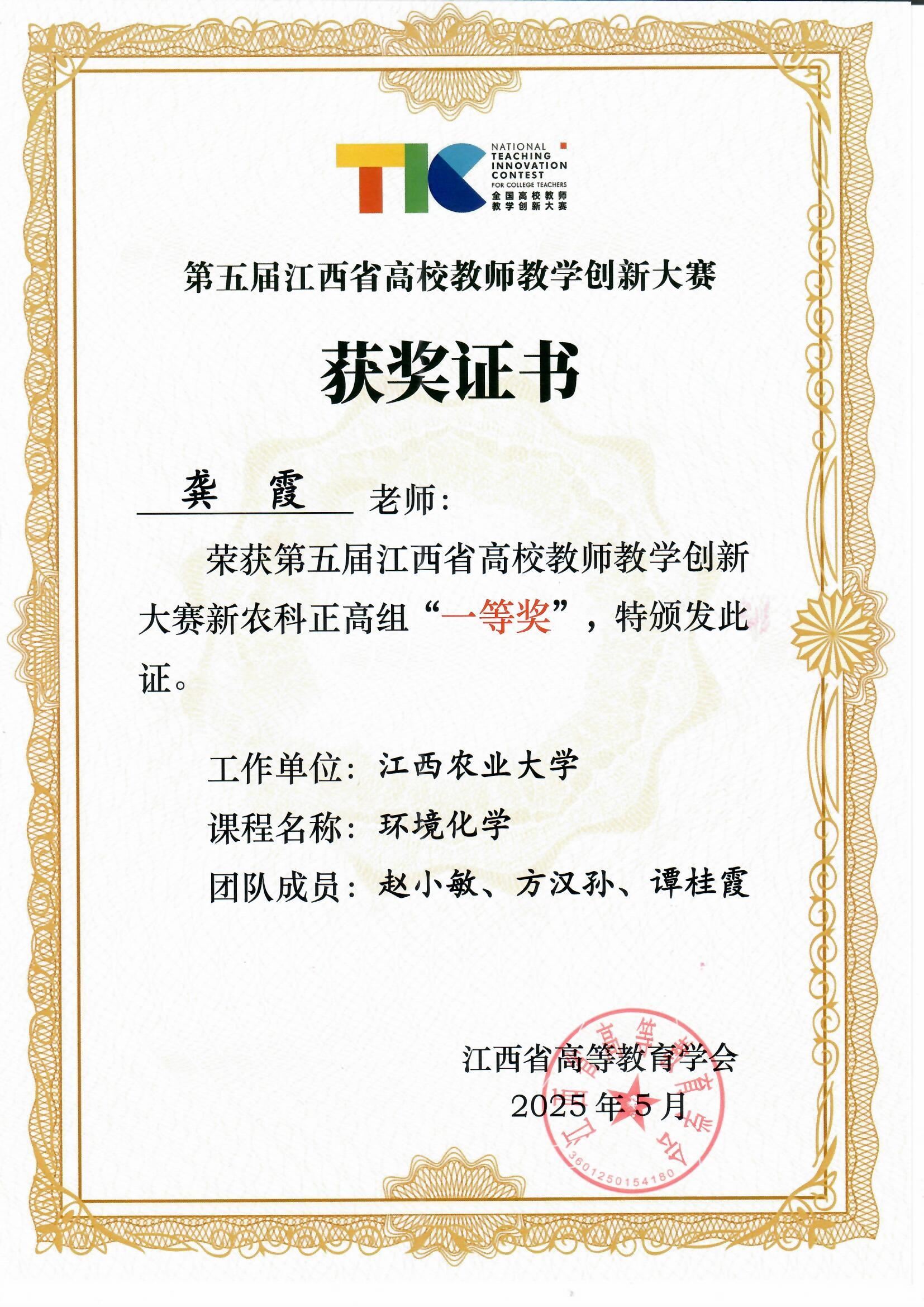 2025年5月,江西省第五届高校教师教学创新大赛结果揭晓,beat365龚霞教授“环境化学”教学团队荣获新农科正高组一等奖。