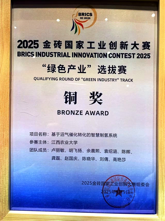2025年9月,2025金砖国家工业创新大赛“绿色产业”选拔赛圆满落幕,由副院长卢丽敏教授领衔的师生团队凭借《基于沼气催化转化的智慧制氢系统》项目脱颖而出,斩获选拔赛铜奖。