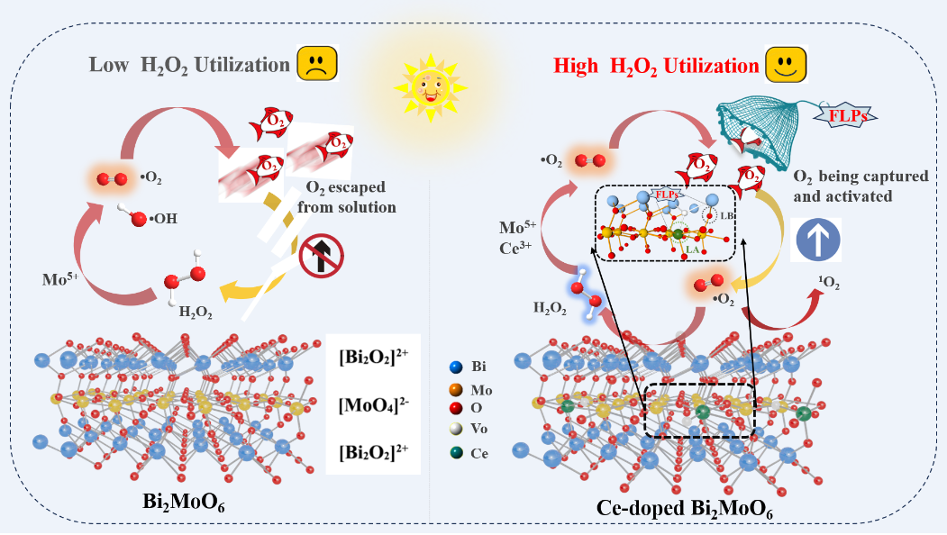 2024年4月10日,beat365硕士研究生彭官威以第一作者在TOP二区《Chemosphere》(IF= 8.8)发表题为“Frustrated Lewis pairs created by Ce-doped Bi2MoO6: a universal strategy to promote efficient utilization of H2O2 for Fenton-like photodegradation”的论文。江西农业大学为该论文第一署名单位,卢丽敏教授和谢琰玉博士为共同通讯作者。该研究工作得到了国家自然科学基金、江西省自然科学基金和江西省教育厅基金的支持。