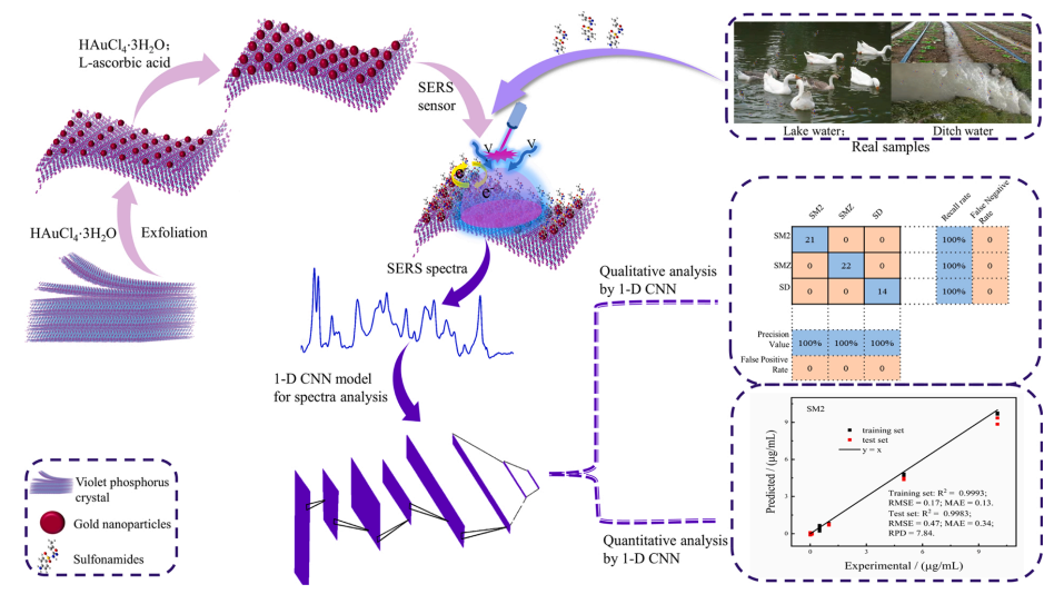 本文采用原位种子介导生长法制备了具有高重复性、重现性、稳定性和高灵敏度的新型二维材料(紫磷烯)修饰的金纳米颗粒SERS传感器,检测多种磺胺类药物。同时,本文提出了一种基于一维卷积神经网络(1-D CNN)的深度学习策略,解决了在0.005 ~ 10.00 ug/mL范围内三种结构相似的磺胺类药物呈现的光谱特征峰相似无法辨别的问题。该模型也成功用于磺胺类药物的定量分析,在相同浓度范围内计算的回收率优于传统线性回归方法。该工作为制备以二维纳米材料修饰的金属纳米颗粒作为SERS传感器以及具有相似结构的多种分析物的鉴别和检测提供了新的参考。
