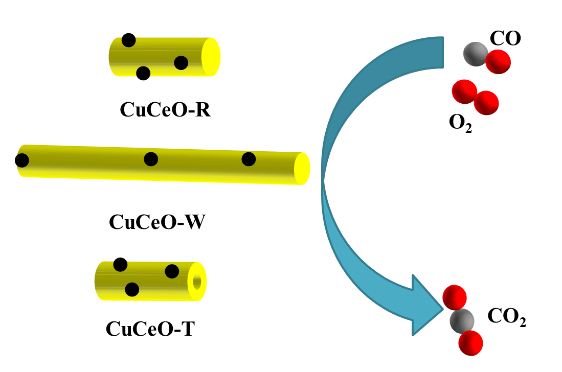 一维纳米CeO2具有独特的界面效应,为探究一维CeO2形貌与CuO/CeO2活性的关系,该论文采用水热法合成了一维纳米CeO2 (棒状、线状和管状),并以其为载体制备了CuO/CeO2催化剂用于CO-PROX反应,结果表明具有管状形貌的CuO/CeO2催化剂具有最强的低温活性。