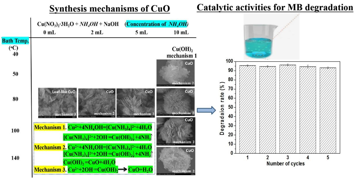 高级氧化技术是处理水中有机污染物的重要途径之一,该技术的核心是开发高效催化剂,价廉高效的过渡金属氧化物一直是研究热点之一,但其传统制备途径耗时、工艺繁琐、能耗高。该论文采用“一步化学沉淀法”,仅通过调整反应温度和氨水用量即可快捷、高效制备出3D花状和2D叶状的氧化铜,制备过程无需高温焙烧和使用形貌导向剂。结果表明,“一步化学沉淀法”制备出的氧化铜对亚甲基蓝具有良好的催化活性,构效关联分析发现,氧化铜的形貌和孔容对活性具有重要影响。这项研究为形貌可控氧化铜的高效制备提供了新途径,为有机废水处理提供了高效催化剂。