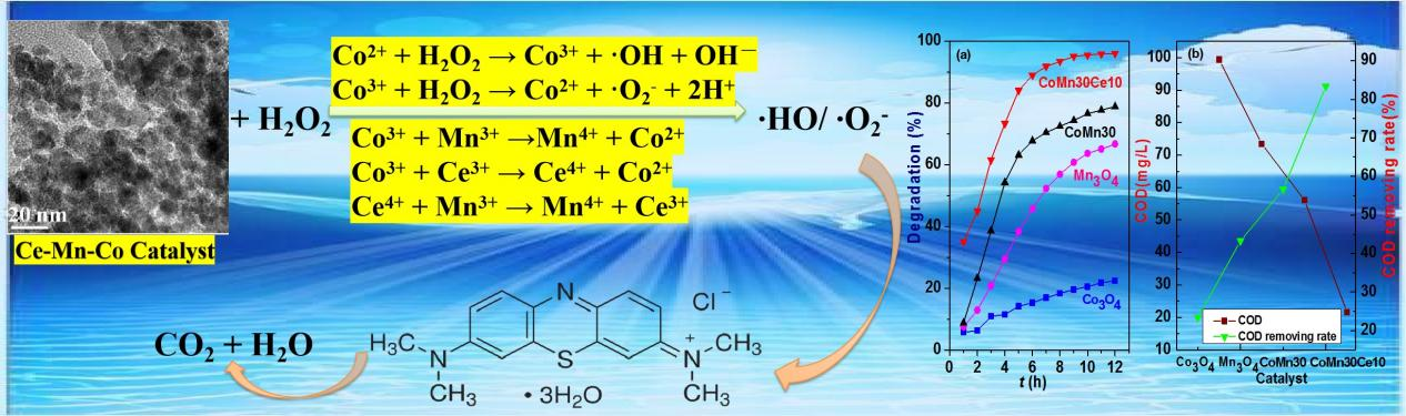钴锰基金属氧化物催化降解有机染料的研究逐渐成为热点,但其催化效果差异大且金属间的协同作用不清楚。该论文采用固相球磨法制备了Ce修饰的Mn-Co三元金属复合氧化物,并将其用于活化H2O2降解亚甲基蓝的模型反应,进一步通过动力学研究、自由基猝灭实验研究了反应机理。Ce-Mn-Co三元体系对亚甲基蓝100%的脱色率和84%的COD去除率主要是由于金属间的协同效应,促进了晶格缺陷的增多、比表面积的增大和颗粒尺寸的减小,羟基自由基(·OH)比超氧自由基(·O2-)起主导作用。