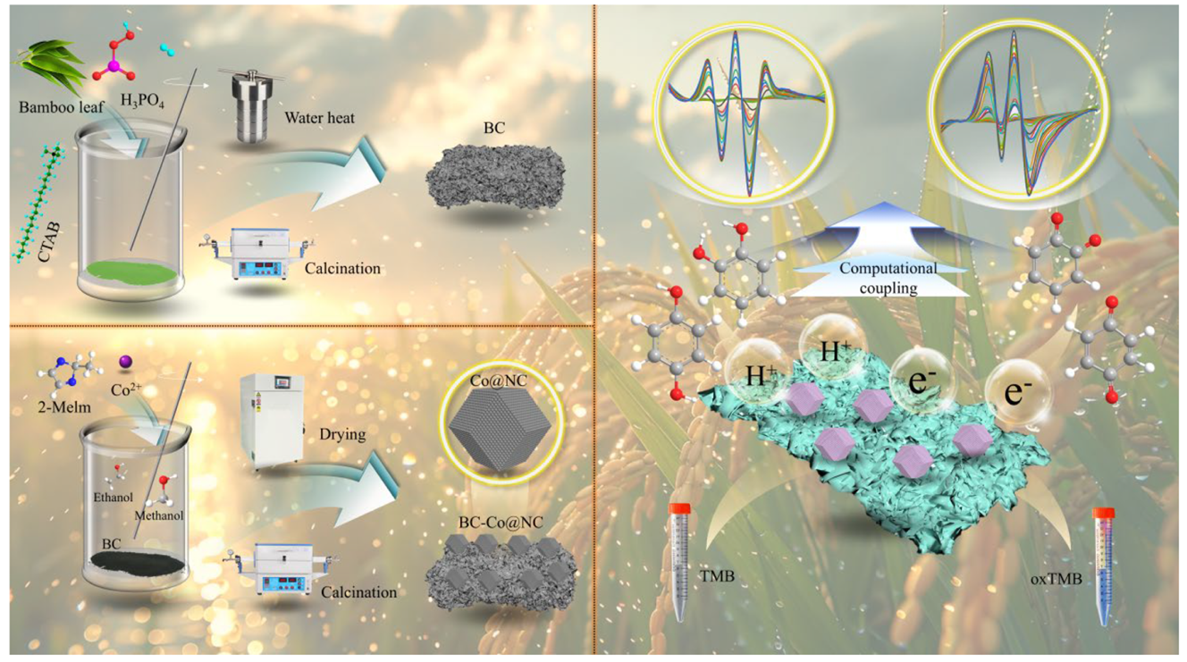 为解决这一难题,研究团队构建“材料设计--信号算法”双协同传感平台。在材料设计方面,以竹叶片生物炭(BC)为基底,通过拓扑碳化ZIF-67前驱体,制备出具有三维分级孔道与原子级分散Co-N4活性位点的BC-Co@NC复合材料。在信号算法开发上,利用基于Savitzky-Golay平滑的一阶--二阶导数伏安级联(FS-DVC)算法,通过一阶导数消除基线漂移、二阶导数锐化峰形,结合动态阈值分割技术,将CC与HQ的氧化峰分离度提升至152 mV,有效解决传统伏安法信号重叠的核心问题。