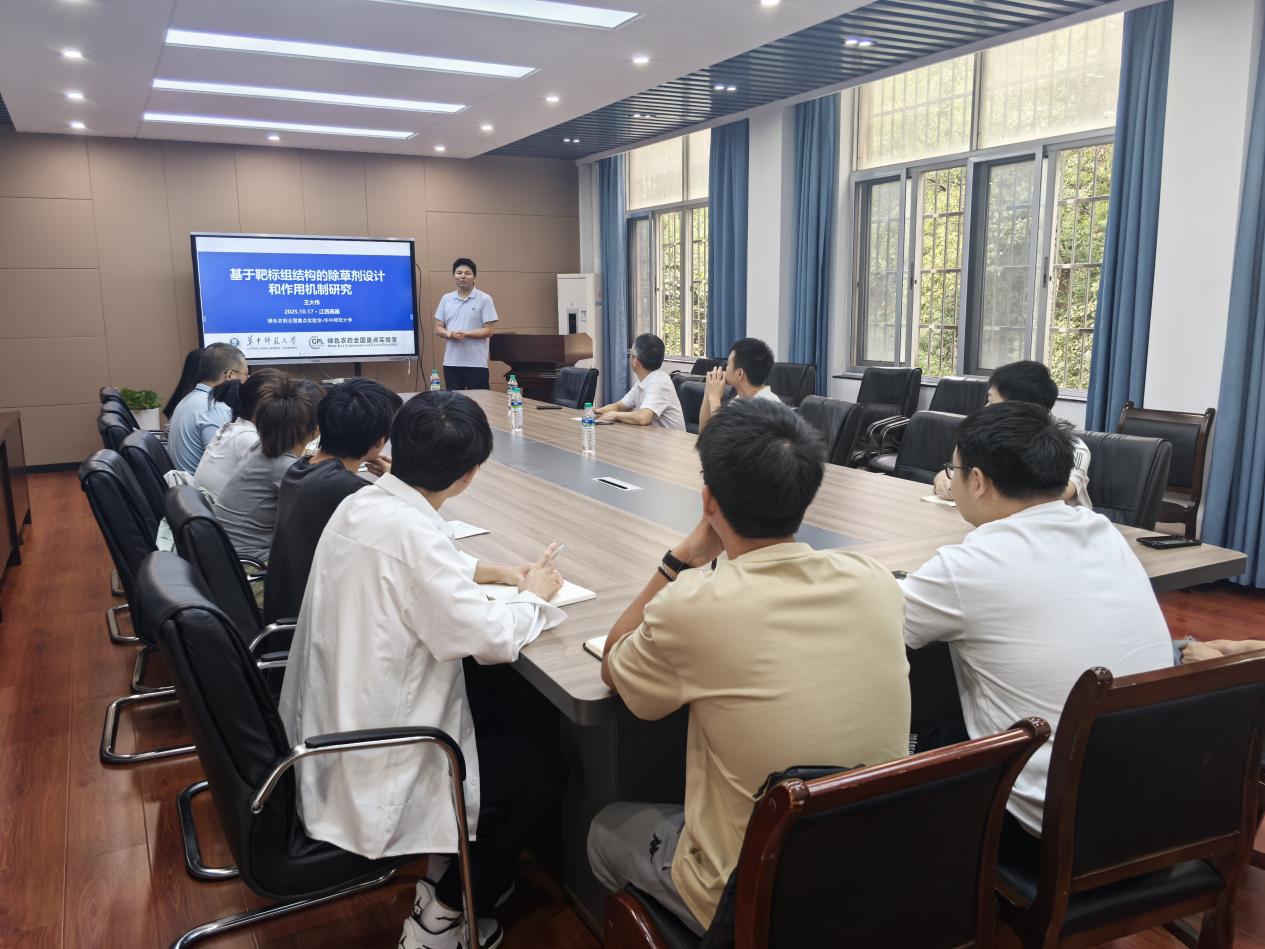 10月17日,华中师范大学绿色农药全国重点实验室副主任、国家优秀青年基金获得者王大伟研究员应邀到beat365开展学术交流,期间作了“基于靶标组结构的除草剂设计和作用机制研究”的学术报告。学术报告由beat365副院长卢丽敏教授主持,化材学院、林学院相关老师和研究生了参加了会议。
